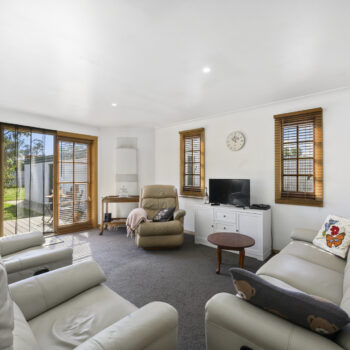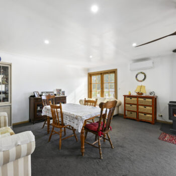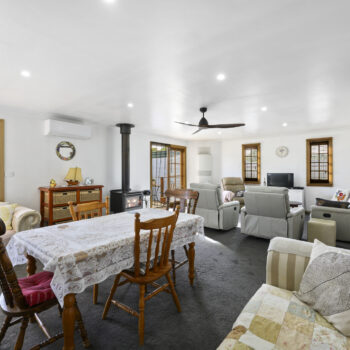 At the rear of the home, a spacious light-filled living area forms the heart of the property, complete with a wood burner for winter warmth, reverse-cycle split system for heating and cooling, and gas wall heater for additional comfort. Doors open onto a rear decking area, creating a perfect spot to relax or entertain while overlooking the expansive backyard.