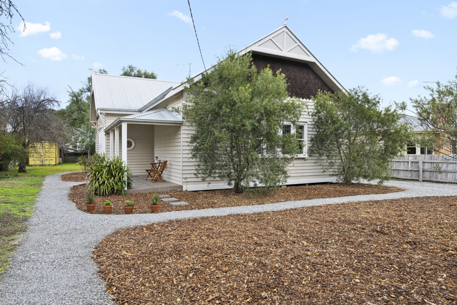 Step inside to discover soaring ceilings with original pressed tin, ceiling fans in the bedrooms and lounge, and an inviting wood fire for winter evenings. A reverse cycle split system in the open-plan kitchen ensures year-round comfort.