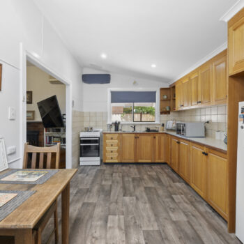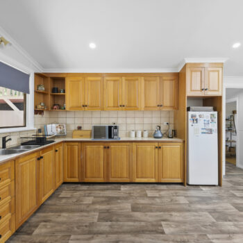 Inside, the home showcases Baltic timber floors, freshly painted interiors, and a cosy lounge with a wood heater, supported by multiple reverse-cycle split systems for year-round comfort. The country-style kitchen with skylight, electric stove, and inviting dining connection forms the heart of the home.